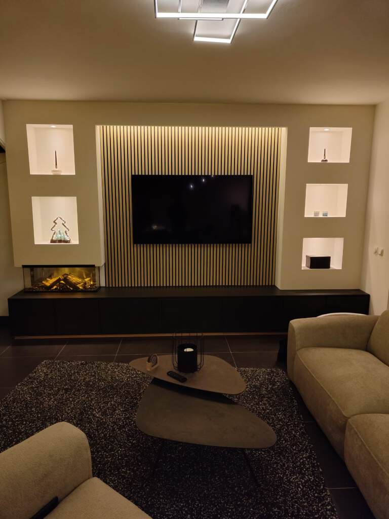 Daarom hebben wij gekozen voor een combinatie van een houten lattenwand, ingebouwde niches en een strak afgewerkte cinewall.